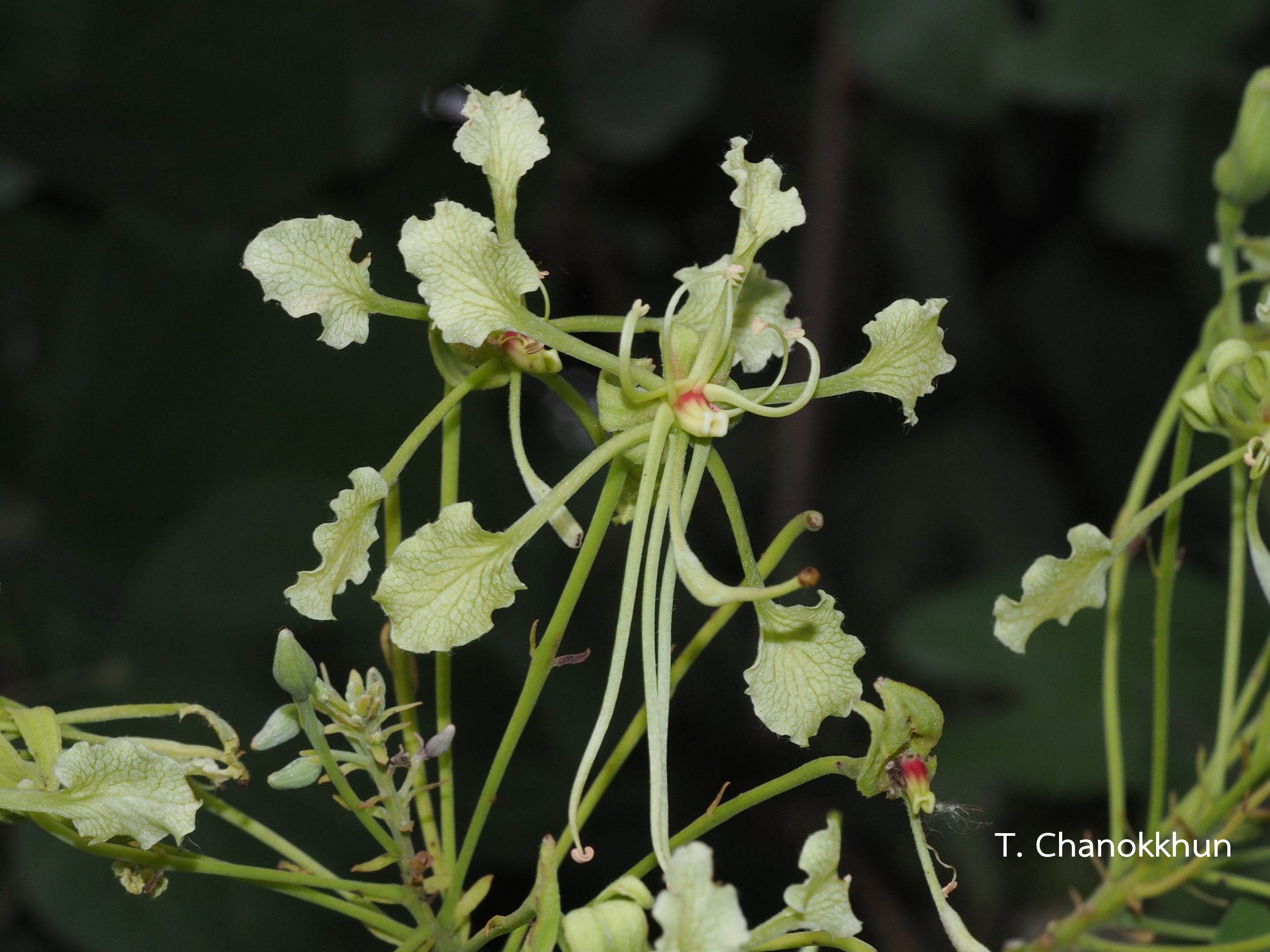 ไม้เถา สูง 5-10 เมตร เปลือกต้นและกิ่งก้านมีขนสั้นนุ่มคลุม หูใบเป็นติ่งคล้ายเคียว ยาวได้ถึง 1 ซม. ใบเดี่ยว รูปไข่กว้างหรือรูปกลม กว้าง 4-8 ซม. ยาว 3–15 ซม. ใบแฉกลึกไม่ถึงกึ่งหนึ่ง โคนใบเว้า ปลายใบมน ขอบใบเรียบแผ่นใบบาง เส้นโคนใบข้างละ 4–5 เส้น ก้านใบยาว 4-7 ซม. ช่อดอกแบบช่อแยกแขนงออกที่ปลายยอด ใบประดับรูปใบหอกหรือรูปไข่ ก้านดอกยาว 4–7 ซม. ใบประดับย่อยติดประมาณกึ่งกลางก้านดอก ตาดอกรูปขอบขนาน ฐานดอกสั้น กลีบเลี้ยง 5 กลีบ พับงอ ยาวเกือบ 1 ซม. ดอกสีเขียวอ่อนแกมเหลือง กลีบรูปใบพาย ยาว 0.5–1.3 ซม. ขอบกลีบจักมน ก้านกลีบยาวกว่าแผ่นกลีบ เกสรเพศผู้ที่สมบูรณ์ มี 2–3 อัน ก้านชูอับเรณูยาว 2-3.5 ซม. เกสรเพศผู้ที่ลดรูป มี 6–7 อัน อันยาวหนึ่งอันติดระหว่างเกสรเพศผู้ที่สมบูรณ์ จานฐานดอกเป็นท่อยื่นออก ยาว 0.2-0.4 ซม. เกสรเพศเมีย รังไข่มีขนสั้นคล้ายกำมะหยี่คลุม ผลแบบฝัก รูปขอบขนาน มีขนกำมะหยี่สีน้ำตาลคลุมหนาแน่น ยาว 10-17 ซม. เมล็ด ขนาดเล็ก มี 2-8 เมล็ด